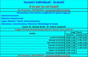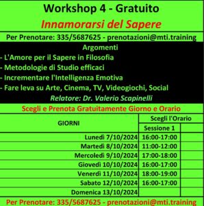 Oltre ai due consueti Workshop Gratuiti “Potenziare la Memoria” e “Incrementare l’Intelligenza Emotiva” e al gettonatissimo “Esprimere il Talento”, ecco le due grandi novità di questa edizione: il Workshop destinato agli adolescenti “Innamorarsi del Sapere” e gli Incontri Individuali “A tu per tu col Coach” per un ascolto personalizzato delle esigenze dei singoli.